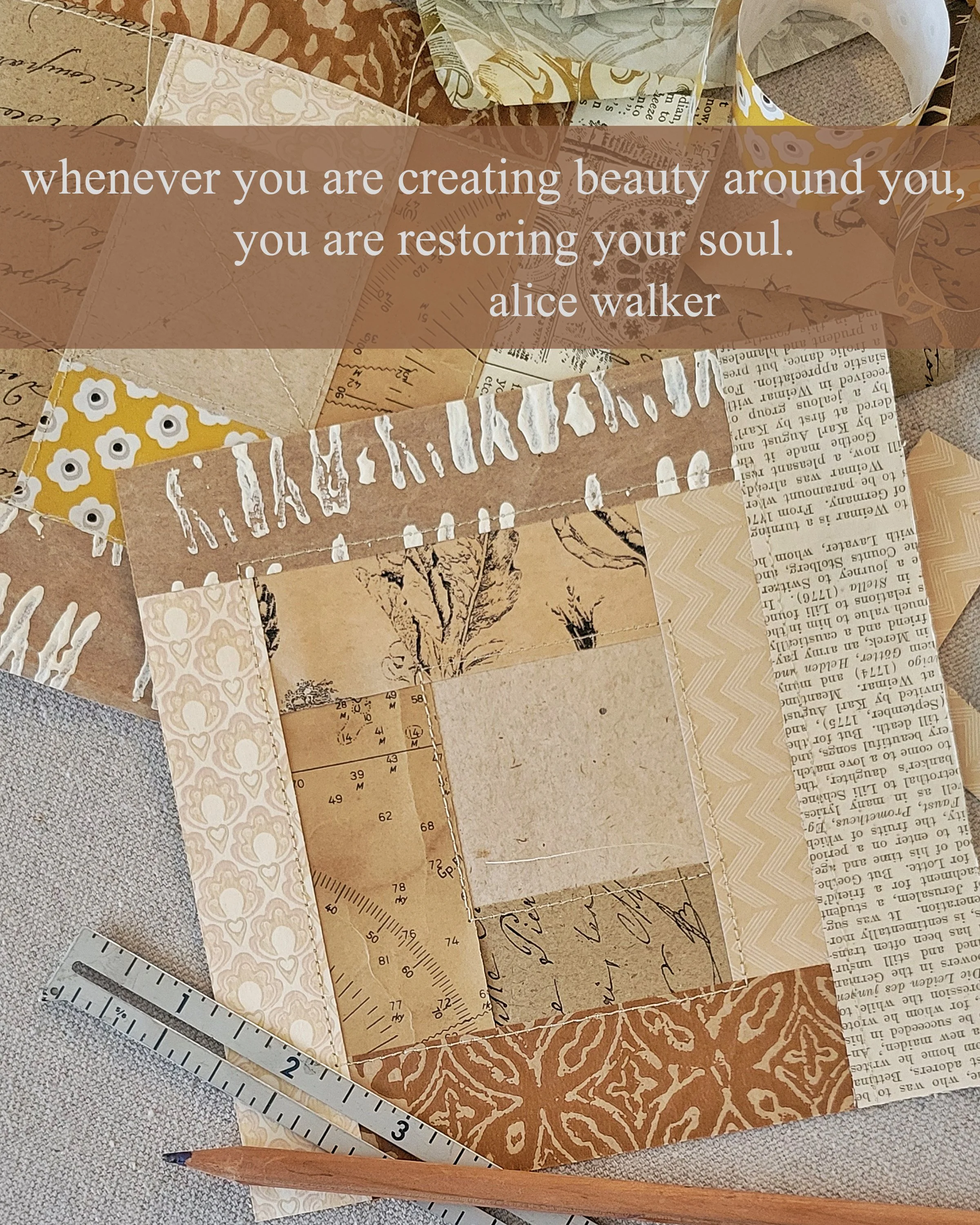There are times, as shown in the present days, that it is best to focus on what can bring you joy…or at the very least, provide a moment of calm. I’m thankful that I have a space where I can jump into paper, glue, thread or fabric and make whatever calls to me. I realize that not everyone has the space or the time or the materials to be creative…so it’s one of the reasons why I like to offer simple workshops…providing a space with materials and inspiration so that you can do as you wish for a hour or two of time.