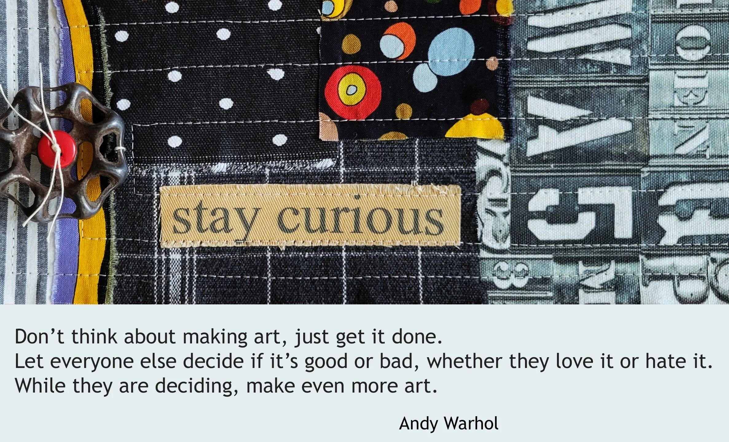 Meanwhile, I’ll be playing with paint and fabric…and sewing…and making collages and concocting anything else that catches my attention because stay curious is my motto.