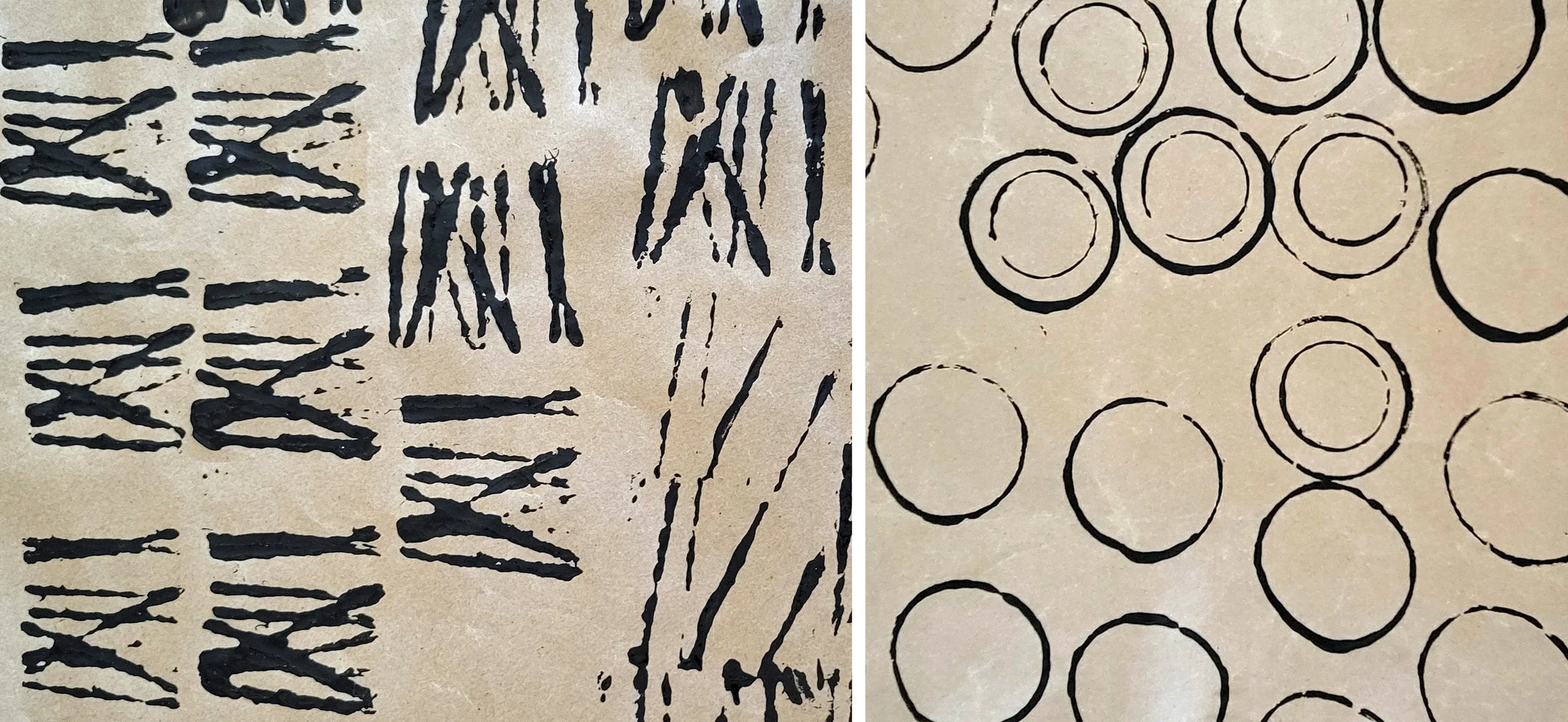 But then I thought…why not print my own fabric? Something simple and graphic…I pulled out a length of muslin, a piece of kraft paper for practice, a bottle of black gesso, a few miscellaneous objects…and went to work.