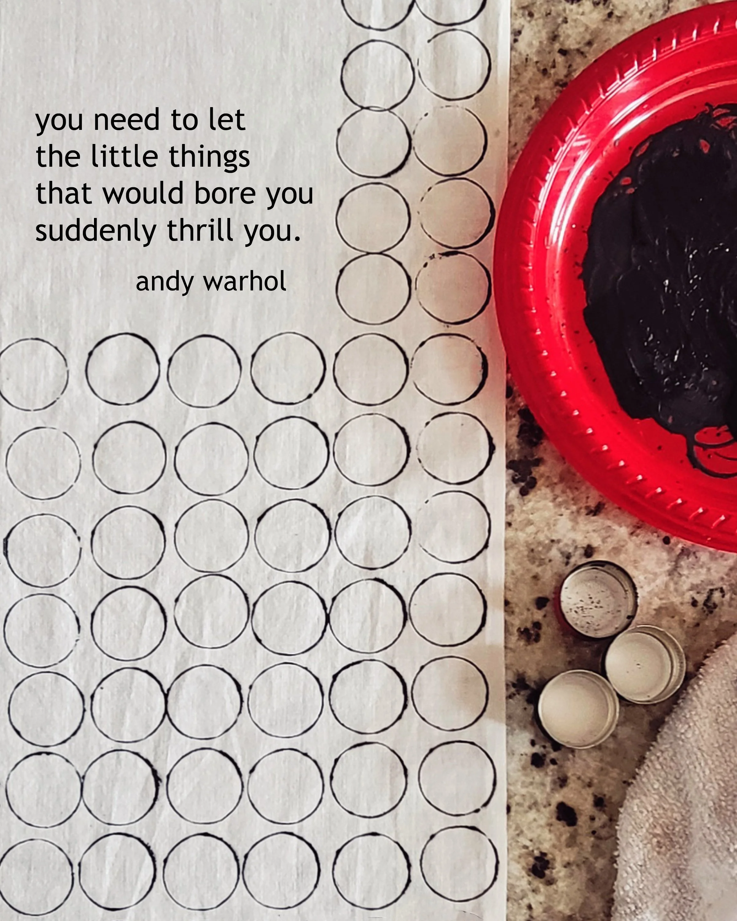 After a few duds, I discovered that the metal screw top from a wine bottle gave me the perfect size of a circle with the most delicate line. It took a bit of practice to get an image without too much paint as well as lining up the circles in some order…but I told myself that these imperfections are evidence that this fabric was not commercially printed!